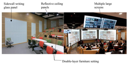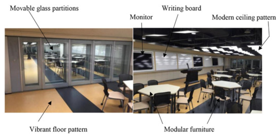 The three classrooms (N-001, N-002, and N-003) were originally a large lecture room. The long-shaped lecture room was subdivided into three smaller classrooms by movable glass partitions, enabling flexible use of space for diverse types of group activities (Figure 3). Modular tables and movable chairs facilitate speedy grouping into different sizes. Installing multiple monitors and writing boards in a single row behind the lectern facilitates teaching in different presentations. The design adds convertibility and flexibility to the original lecture room.