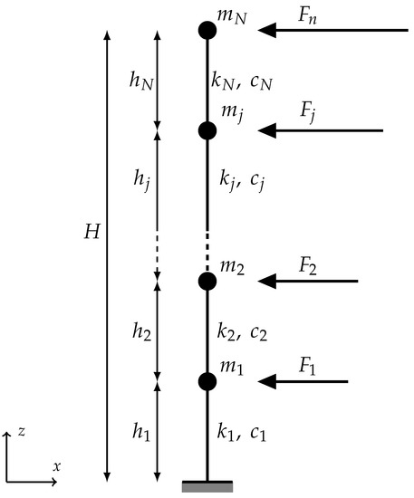 Let us now focus on the building structure model herein considered. The mass matrix turns to be diagonal and the vector equal to . Such circumstances leads to a special form for Equation (11):