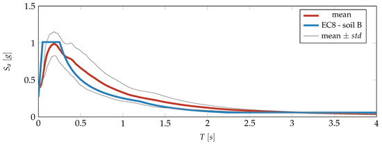 The design influence of the lateral load patterns investigated in this study is analysed through linear time history dynamic analyses performed on a set of 942 ground motion records registered from 236 seismic events, all of them retrieved from the ground motion database of the Consortium of Organisations for Strong Motion Observation Systems (COSMOS) [30]. Their moment magnitudes range from to , whereas the epicentre distances from 4.00 km, the closest, to 83.00 km, the farthest. Figure 2 depicts the mean spectrum of all the selected ground motions (red line) compared with the Eurocode8 spectrum, whose parameters are show the Table 1.