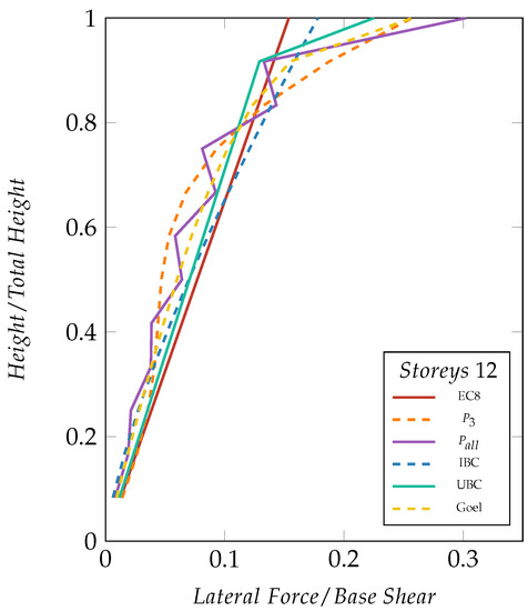 Non-linear dynamic analyses carried out on seismic resistant structures and also shaking table tests [12,13,14] designed according to a force distribution compliant with the Eurocode 8 (EC8) [5] have often pointed out that top storey structures are subjected to high inter-storey drift demand [15,16,17]. This effect increases as far as the number of storeys increases and was also proved by the findings of Ruiz-Garcia 2010 [18]. Furthermore, this work underlines a larger demand of residual displacements in the upper part of multi-storey buildings if the first-mode proportional force distribution is applied to design them. This could be likely due to higher mode effects [18]. To face this problem, many codes propose different patterns for horizontal force distributions, inter alia, UBC [19], ASCE 7-10 [20] and SEAOC 1999 [21], which are still framed in the equivalent force methods. One other effective force distribution is the one proposed by Chao et al. [1] in which a concentrated force of high magnitude is applied to the very top storey.