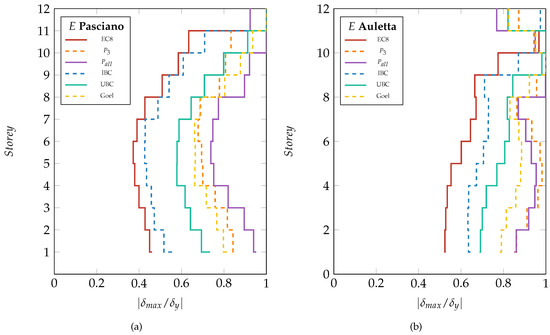 Figure 4a,b report on the x-axis the maximum dimensionless relative displacement at each level corresponding to each storey. Each curve reported in the two panels depicts the data related to a different load pattern, as reported in the legends, used for design purposes. Figure 4a,b refer to the SOUTHERN ITALY 1980—Pasciano cimitero—HNN and the CENTRAL ITALY 2016—Auletta (Petina)—HNN strong motions, respectively. Figure 4 shows that the structures, which have been designed with load patterns prescribing larger forces at the topmost storey, give better results in term of maximum relative displacement distribution. The distribution , which is slightly different from , outdoes the first-mode-proportional pattern, even if it additionally accounts for the second mode. These first two also share another flaw which is the fact that the maximum relative displacement is always attained at the last floor. Regarding the code provision, it gives reasonable results in term of dispersion around the mean, and it tends to move down the position where the structure attains the maximum displacement. Lastly, the , and Goel distributions give the best results, providing the hard proof to substantiate the need of considering higher mode effects. Obviously, for lateral resisting structures where the dissipative devices are all over evenly located, the optimum deflected shape would be having all dimensionless relative displacements equal to 1 with a consequent 0-dispersion. As it can be observed from the two panels, the response of the system is strongly dependent on the characteristics of the earthquake records.