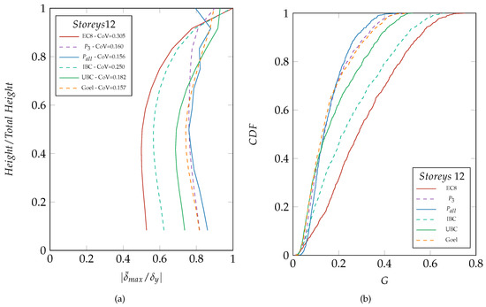 Mean maximum dimensionless inter-storey displacement distribution of the 12-storey SBMdesigned according to the load patterns (a) and CDF of the variance of the deflected shapes (b).