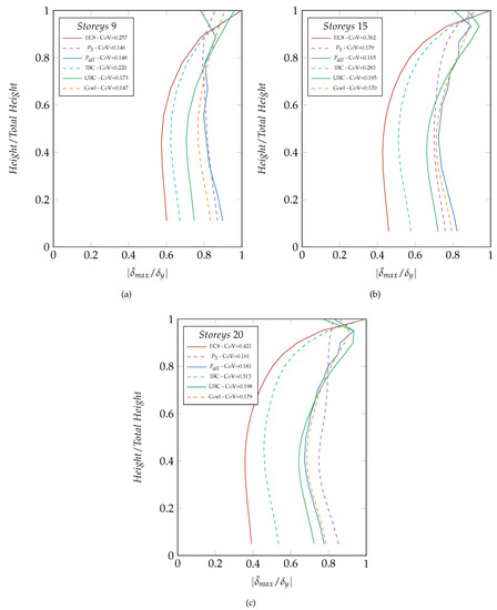Figure 6 shows the results of the same analysis performed in the previous paragraph bur the number of storeys. Structures with 9, 15 and 20 storeys were designed with the 6 lateral load patterns under study and hence analysed in the same fashion of the 12-storey structure. The displacement demands are pretty much the same that have been seen before. The , , and Goel keep giving good results, proving that they are able to catch the effects of higher modes. The depicted in the legend for each curve help make out the differences. For instance, the for and Goel rises from about 0.15 for the nine-storey structure to 0.17 for the 20-storey structure, which means that the displacement demand is quite constant while increasing the height of the structure.