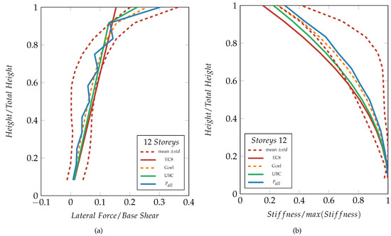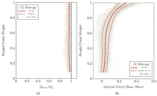 (a) Maximum dimensionless inter-storey displacement patterns for the 942 ground motions on the 12-storey SBMobtained from the GA proposed procedure. (b) Obtained lateral force distributions.