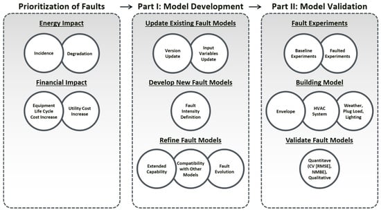 Figure 1 shows the workflow of the study documented in this paper and the companion (Part II) paper. The fault models considered in this study were those identified as highest priority by Kim, Cai, and Braun []. Based on an extensive literature review and communications with experts in the field, we estimated annual energy impact, reflecting the occurrence percentage and performance degradation of each fault, and the financial impact, reflecting the utility cost increase and life cycle cost increase of each fault. The estimates were used to prioritize faults that have a significant impact on nationwide energy consumption.