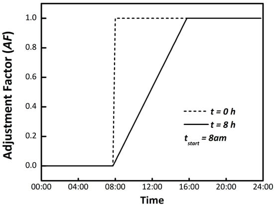 Figure 2 shows an example of how fault evolution is implemented. The time required (τ) for the fault to reach the full level is user-specified and required only if the user wants to model fault evolution. If fault evolution is not desired, τ can be set equal to zero such that the user-defined fault intensity will be imposed as a step function. However, by defining a nonzero value for τ, the fault-starting timestamp, and fault-ending timestamp, the user can enable fault evolution in the model. An adjustment factor (AF) is calculated at each time step (beginning with the starting timestamp) to gradually impose the fault intensity over the user-specified time frame, as shown in Equation (1). In this equation, AF(t) is the adjustment factor for the fault intensity in the current time step of the simulation, calculated based on the adjustment factor from the previous time step (AF(t−∆t)), simulation time step (∆t), and the time required for the fault to reach the full level (τ). AF(t) is then multiplied by the user-defined fault intensity at each simulation time step. This feature is implemented via the Energy Management System object in EnergyPlus. Although at present the implementation simplifies the relationship between time and fault intensity by assuming linearity, it is possible to modify the Energy Management System code to implement nonlinearity—including discontinuous evolution where the fault intensity changes only when certain equipment is in use (direct expansion (DX) unit, fan, and so on)—if better data for understanding the fault evolution become available.