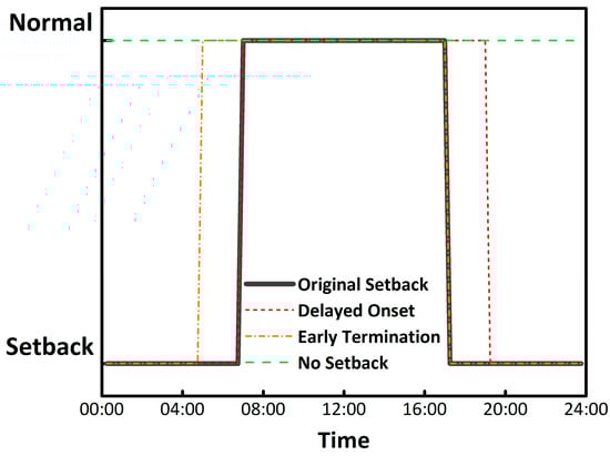 Figure 3 shows example plots of differences among setback fault types. As an example, if the onset of the setback is delayed for 2 h, the setback setpoint starts at 7 pm instead of 5 pm The definitions of the fault intensity of each model can be found in Table 1.