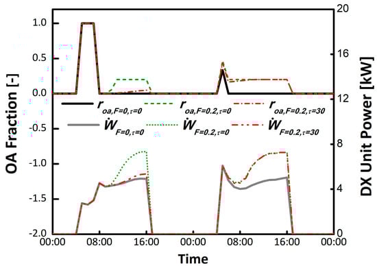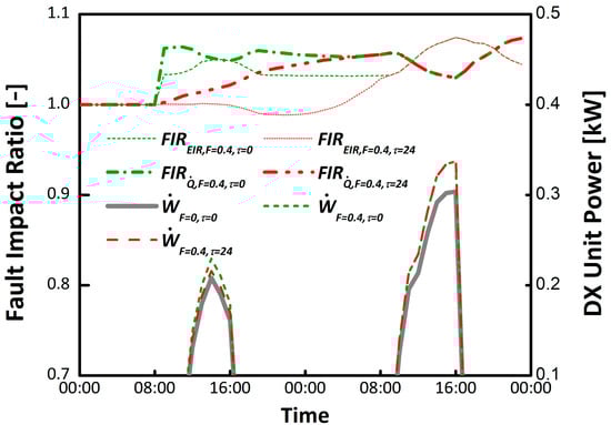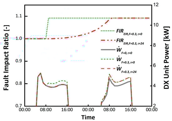 Figure 9 shows a simulation example of 48 h of DX unit operation with three different cases: fault free operation (FI = 0, τ = 0 h), faulted operation without fault evolution (FI = 0.3, τ = 0 h) and faulted operation with fault evolution (FI = 0.3, τ = 24 h). Condenser fan degradation starts at 8 am on the first day. The condenser fan degradation fault affects only condenser fan power; it has no effect on the cooling performance (total cooling capacity) of the vapor compression system. A simple equation shown in Equation (5) is used to characterize the impact on equipment efficiency (FIREIR) that is based on a derivation provided in Cheung and Braun []. For the case without fault evolution, the fault impact ratio for EIR (FIREIR,F=0.3) is calculated with Equation (5) and is applied to the conversion from the cooling capacity to power consumption in each time step. For the case with fault evolution, the fault impact ratio (FIREIR,F=0.3,τ=24) is also calculated with Equation (5), but fault intensity (FI) is now affected by the adjustment factor at every time step, and FIREIR,F=0.3,τ=24 gradually increases to reach the full level in 24 h. These changes in FIR result in additional cooling energy consumption (F=−0.3,τ=0, F=−0.3, τ=24).