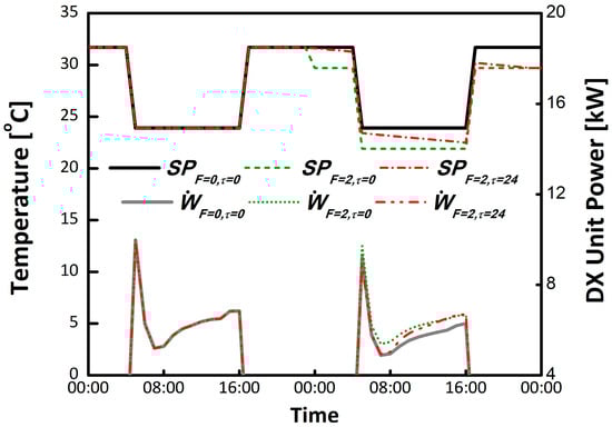 Figure 5 shows a simulation example of 48 h of system operations including three cases: fault free operation (FI = 0 K, τ = 0 h), faulted operation without fault evolution (FI = 2 K, τ = 0 h), and faulted operation with fault evolution (FI = 2 K, τ = 24 h). As shown in this figure, the fault starts at the beginning of the second day and the cooling setpoint temperature is reduced by 2 °C to mimic a condition where the sensor reads 2 °C higher than the true value. As a result, the cooling energy consumption increases in both faulted cases.