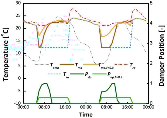 Figure 6 shows a simulation example of 48 h of economizer operations with and without the fault, in which the economizer outdoor air damper is stuck at 30% for the faulted condition. As shown in this figure, there are opportunities for free cooling during early occupied hours (around 6 am) because the outdoor temperature is below the supply air temperature setpoint. However, as temperatures rise later in the day, it becomes advantageous to close the damper. Whereas the normally operated economizer modulates the outdoor damper to set the mixed air temperature to the supply air temperature setpoint, the faulted damper position is stuck at 30%. The stuck damper results in a higher mixed-air temperature compared to the mixed-air temperature of the normally operated condition in this scenario. Because this mixed-air temperature must be cooled down to the supply air temperature setpoint, the faulted case results in additional cooling energy consumption.