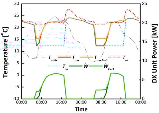 Figure 4 shows a simulation example of 48 h of system operation for this fault, including three cases: fault free operation (fault intensity (FI) = 0, τ = 0 h), faulted operation without fault evolution (FI = 0.2, τ = 0 h), and faulted operation with fault evolution (FI = 0.2, τ = 30 h). When there is a 20% (of the return airflow rate) leak at the return air duct, the fault model overrides the economizer to increase the outdoor air fraction. Then, the return air stream coming into the mixing chamber is reduced by the same amount of that addition. As shown in Figure 4, the additional fraction of the outdoor air under the unfavorable ambient condition results in additional cooling energy consumption. In the scenario with fault evolution, we observe a steady increase in the outdoor air (OA) fraction and direct expansion (DX) unit’s energy consumption until the leak stabilizes at 20% in 30 h (τ = 30 h).
