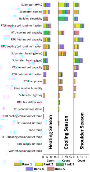 The Submeter: the HVAC sensor showed the highest count for all seasons and for all considered faults, because it includes fault impacts from the heating, cooling, and ventilation (fan) subsystems. Submeter: cooling was the second most counted sensor; it is affected by all faults in the vapor compression system. The whole-building electricity measurement (building electricity sensor in the figure) is ranked third overall in frequency, even though it was never selected as one of the first two sensors in the prioritized lists of Tables S1–S3. As expected, the heating-related sensors (e.g., RTU heating coil runtime, RTU heating coil capacity, submeter: heating [gas], and VAV reheat coil capacity) were rarely included in the cooling season’s prioritized sensors list, as shown in the cooling season column in Figure 10. Measurements of the zone air temperatures and temperatures in the RTU (e.g., fan outlet, heating coil outlet, supply air, and VAV reheat coil outlet) were never indicated as prioritized sensors for any faults or season.