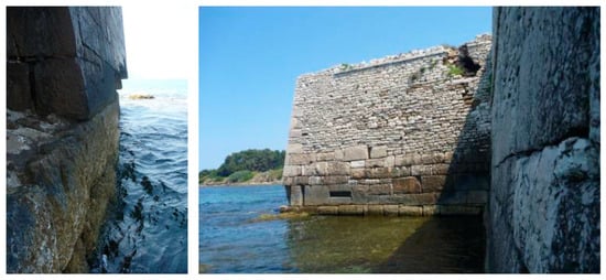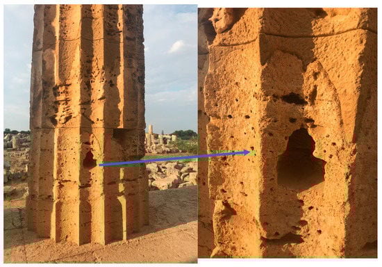Major causes of physical and chemical deterioration of natural stones in historic structures include crystallization of soluble salts causing salt weathering (Figure 1), frost, pollutants, vegetation growth (Figure 2), seismic effects and combinations of all the above (Figure 3). The common ground for all these causes of deterioration is the moisture that penetrates into the stones. The outcome of the decay is loss of cohesion (sanding, powdering, and/or chalking), delamination/exfoliation or cracking of the material [], and detachment of the outermost layers, leading to a decrease in strength [].