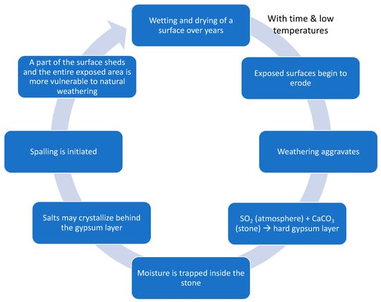 In fact, most frequently, decay is initiated by water penetration and aggravates with time, as the cycles of wetting and drying continue (Figure 4). Stones in coastal areas are even more severely affected by salt weathering (Figure 5). As all masonry structures degrade by weathering, consolidation is one of the most widely accepted treatments offered. Consolidation, essentially, is a detailed process by which consolidants are applied on weathered stones (plaster or mortar) in order to enhance the cohesion, restore mechanical strength, and impede further physical and chemical degradation. Consolidants should mimic the natural stone in terms of strength, cohesion, porosity, permeability, hardness, chemical proximity, color, thermal dilation, and others. However, the strength provided by the consolidant should not surpass the strength of the underlying sound stone [].