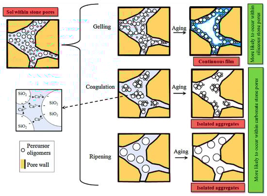 The sol-gel process within the pores of stones that produce silicate gel and xerogel/precipitates. Rounded particles are composed of small siloxanes (Si–O–Si) [].