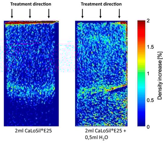 X-ray radiographic images of samples treated with CaLoSiL® (left) and CaLoSiL® and immediately water (right) [].