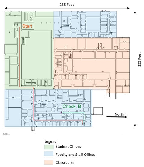 Lawton [] developed a questionnaire to study the relationship existing between wayfinding strategies and gender. Lawton’s [] research emphasized that women were likely to rely on a route knowledge strategy, where men maintained a sense of their position in relation with the environment using survey knowledge. Lawton also highlighted that women tend to develop an anxiety about environmental navigation unlike men [] Taylor et al. [] studied the goal-specific influences on spatial perspective. The participants in Taylor’s 1999 study had two ways to study an unknown environment, studying a plan or navigating through the environment. The results indicated a better performance (more accuracy) for survey tasks when studying a plan and the route tasks responses were more accurate when navigating through the environment []. Therefore, wayfinding strategies are dependent on several factors, which in a broad context includes complexity of a building interior, signage, spatial cognition, format of information used in planning wayfinding, gender, familiarity with a building interior, and number of other individuals travelling the same or similar route []. Understanding how individuals create a cognitive map and the whole process of wayfinding could lead to findings that would help diminish the mental demand of wayfinding tasks allowing individuals to focus on other aspects of their job or environment.