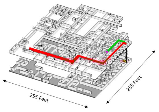 Three-dimensional (3D) BIM of the Route from the Lobby to Checkpoint A in red and Checkpoint A to Checkpoint B in green.
