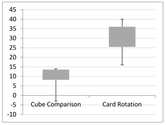 Figure 4 displays the results of the two tests with a box plot, which shows the minimum, maximum, and the second and third quartile. For the cube comparison test, the median was 10.5, and the mean was 10.3. Participants scored high on both tests. The card rotation test scores had a median of 32.5 and a mean of 31.1. The fact that the medians are higher than the means indicates that some participants experienced very low scores making the distribution negatively skewed.