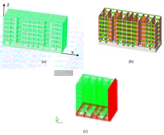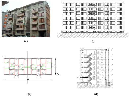 Figure 3d). The main load bearing walls are located in the Y direction, while the load bearing walls in the X direction are attenuated by many openings. The structure is composed of a basement made of reinforced concrete walls. Dimensions of the walls differ and the inner walls in the Y direction are 38 cm thick, while in the X direction the thickness of the outer walls is 30 cm and of two inner walls is 25 cm. The walls in both directions on all the floors are made of solid brick masonry (dimensions of bricks 250 × 120 × 65 mm) and a façade part (non-load bearing) made of hollow bricks 125 mm thick. The slabs are made of semi-prefabricated “Herbst” concrete hollow elements, joists, and a concrete slab of 6 cm. The total thickness of the slab at the storey’s is 26.5 cm, and the same construction is kept for the roof with thickness increased to 43.5 cm. The structure is an unreinforced masonry building with prefabricated slabs, behaving as rigid diaphragms [