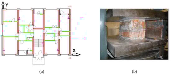 Figure 4a). The mean value of brick compressive strength was 19.4 MPa, while the minimum value was 13.4 MPa putting it into a class of M15 (15 MPa), which fulfills the requirements for a load-bearing wall [
