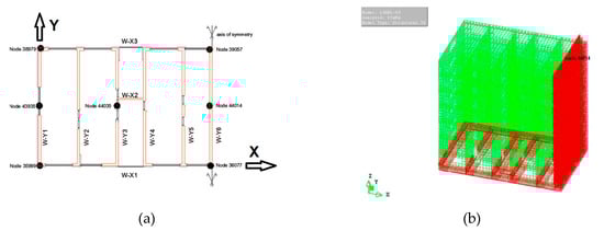 Figure 5a,b). In FEM only half of the structure was modeled and analyzed as the structure is symmetric, employing in total 15,759 CQ40S elements and 45,443 nodes (