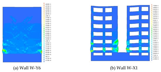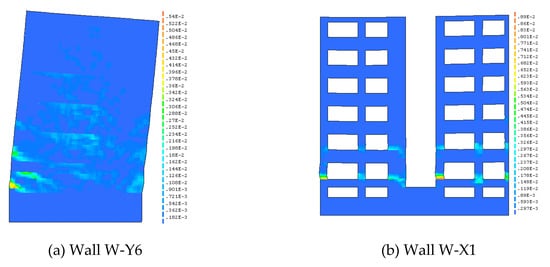 29]). Here, only the results in the X direction of the façade walls will be shown. Damage was again concentrated in the lower floor of the structure with bending and compression failure at the ground level of the structure (