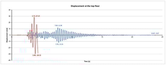 Figure 11 it is evident that, once the structure is exposed to the Petrovac ground motion scaled to 0.2 g, it undergoes very large displacements with a maximum of 29.33 cm after only 3.89 s, which is 2.6 times larger than when the structure was exposed to a 0.1 g scaled accelerogram. It is evident that these types of structures are highly vulnerable to such seismic actions and strengthening measures should be proposed.