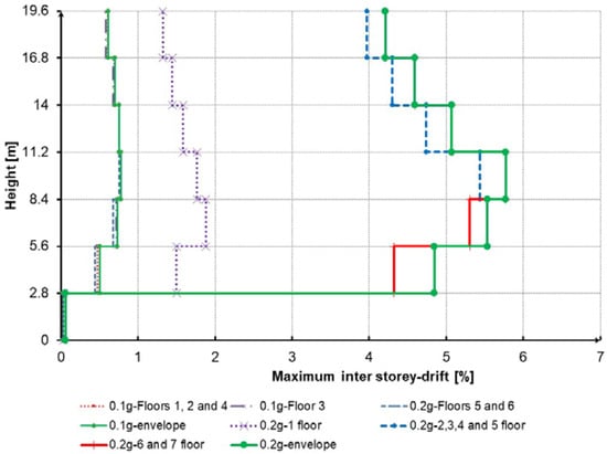 The maximum displacement in the case of 0.1 g is rather small and it amounts to 11.38 cm while for the case of higher seismic activity (0.2 g) the displacement increased to 29.33 cm, which is 2.6 times larger. The maximum inter-storey drift per each floor was calculated separately (as it does not happen simultaneously). The maximum value of inter-story drift of each floor was identified, and an envelope of the inter-story drift was created. Further, the maximum inter-storey drift (envelope) moved from 0.8 % to 5.8 % (