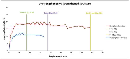 38], while in the case of 0.1g this value was equal to 2.45. The available ductility (the ratio between the ultimate displacement and the elastic limit displacement) was 16.78 for the two analyzed cases. If the structure is to be exposed to an earthquake with PGA of 0.1g this intervention would be acceptable (