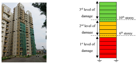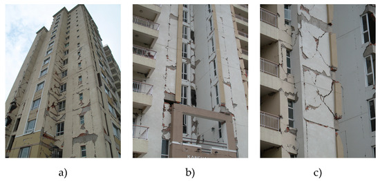Fourteen-storey reinforced concrete structure damaged after the Gorkha earthquake: (a) distribution of the damages from the first to the seventh storey; (b) detachment of the walls from the envelope frame; (c) diagonal cracking with slight out-of-plane detachment of the wall.