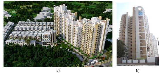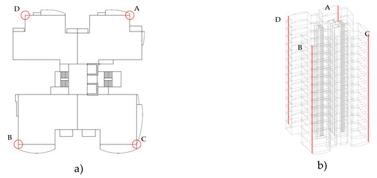 Global overview of the high-rise structure under study: (a) location of the houses and the high-rise buildings; and (b) front view.