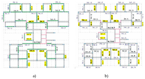 Distribution of the infill masonry walls: (a) ground floor; and (b) remaining floors. Where Par_€ means infill panel number €.