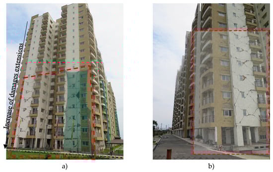 Survey damage assessment of the building: (a) north façade; (b) south-east façade.
