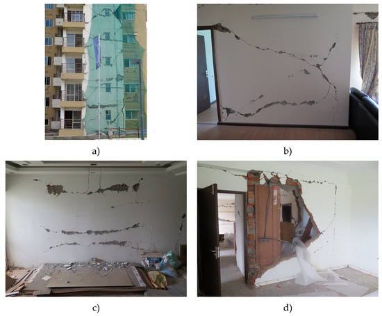 Survey damage assessment of the interior of the building: (a) diagonal cracking in façade wall; (b) diagonal cracking in interior partition wall; (c) sliding cracking in interior partition wall of storey 1; and (d) out-of-plane collapse of interior partition wall.