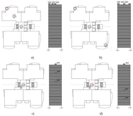 Ambient vibration tests: schematic layout of the seismometers disposition (a) Setup 1; (b) Setup 2; (c) Setup 3, and (d) Setup 4.