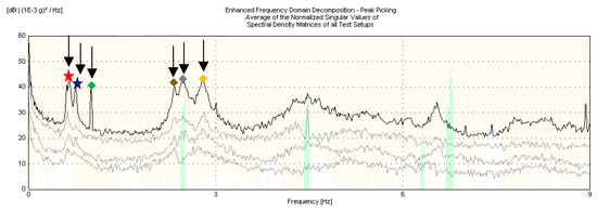 Ambient vibration test: normalized single values of spectral density matrices.