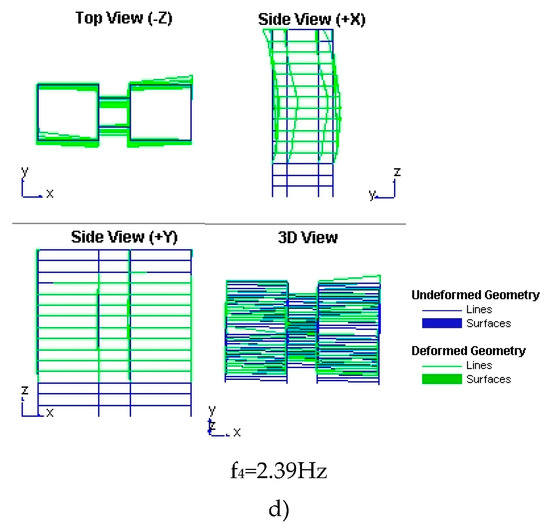 Ambient vibration test results: vibration modes corresponding to (a) 1st frequency; (b) 2nd frequency, (c) 3rd frequency and (d) 4th frequency.