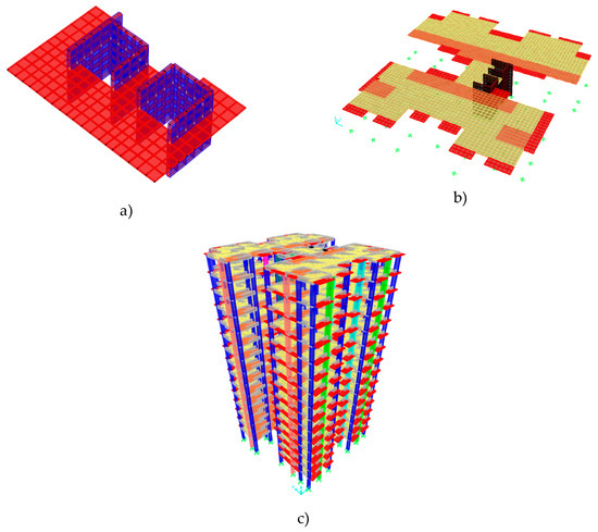 Numerical modelling of RC structure: (a) detail of the RC cores and slabs connection; (b) plan view; (c) 3D view.