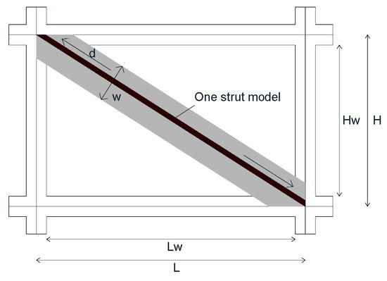 Infill masonry walls numerical modelling strategy: equivalent one strut model (w—strut width; Lw—panel length; Hw—panel height; H—inter-storey height; L—storey length).