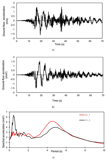 Linear elastic dynamic analysis: (a) accelerogram (direction X); (b) accelerogram (direction Y); and (c) spectral acceleration.