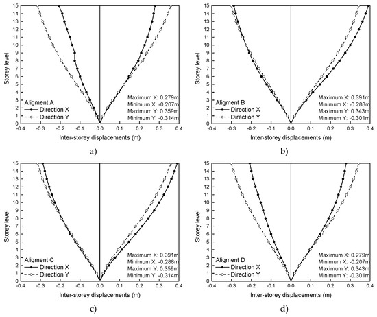 Linear elastic dynamic analysis result: maximum inter-storey displacement of Model 3 (a) alignment A; (b) alignment B; (c) alignment C and; (d) alignment D.