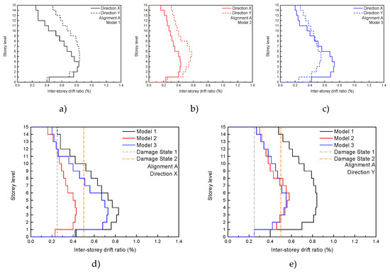 Linear elastic dynamic analysis result: maximum inter-storey drift ration (alignment A) (a) Model 1; (b) Model 2; (c) Model 3; (d) global comparison (Direction X); and (e) global comparison (direction Y).