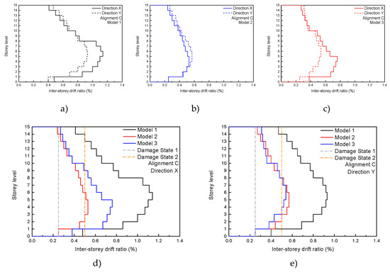 Linear elastic dynamic analysis result: maximum inter-storey drift ration (alignment C) (a) Model 1; (b) Model 2; (c) Model 3; (d) global comparison (Direction X); and (e) global comparison (direction Y).