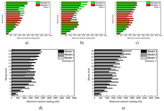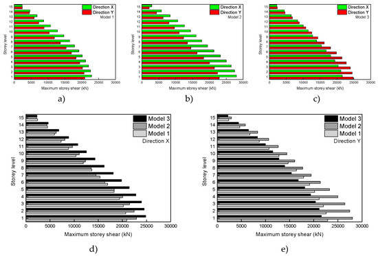 Linear elastic dynamic analysis result: maximum storey shear (a) Model 1; (b) Model 2; (c) Model 3; (d) global comparison (Direction X); and (e) global comparison (direction Y).