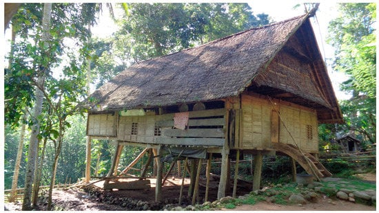 The Ammatoans, also known as the Kajang, have maintained a traditional lifestyle for hundreds of years and synergized with their local natural environment (see Figure 1). This consistency in traditional values significantly influences the structures and forms of Ammatoan architecture [8,9]. As with other traditional buildings in South Sulawesi, Ammatoan vernacular houses are stilt houses. They are characterized, however, by a relative homogeneity, simplicity, small room dimensions, use of natural materials, and lack of ornamentation or other signs of social stratification [10].