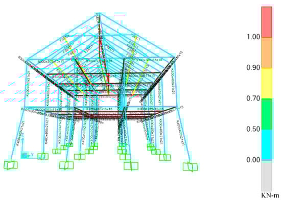 According to the load analysis, the results of which are shown in Figure 3, all piles can properly carry the load. These piles, cyan in the figure above, have the strength to support the building for a long period of time. Field research found that several Ammatoan vernacular houses have been standing for more than 80 years. The piles of these houses have never been replaced, and have been able to consistently carry the load without any indication of damage. However, some supporting beams are colored red in this figure, indicating that these beams tend to lack the ability to handle their load. Many social activities are held in the body of the house, such as weddings, funerals, discussion, etc. Consequently, there is a high probability that these beams require replacement. The Fmax diagram of the load, shown in Figure 4 below, shows the influence of various factors.