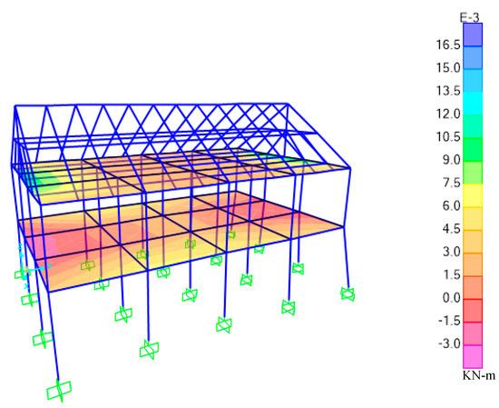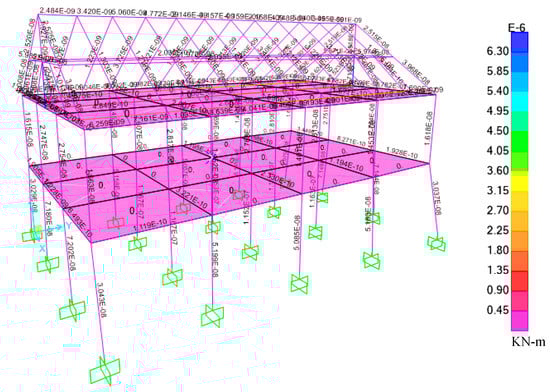 An Fmax diagram depicts the maximum force per length unit in the middle of an element. Its main orientation is presented in such a way that the shear force per length unit is zero. The second floor, or the house body, has a lower main force load than the third level. This can be observed in the color gradation of Figure 4. The relative virtual work (RVW) diagram in Figure 5 shows the virtual work energy as an indication of the force and displacement load pressure.