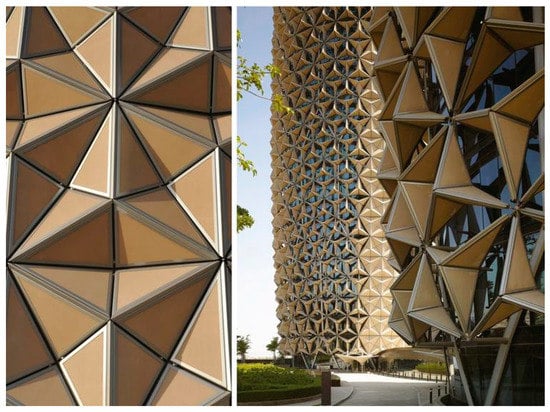 Kinetic architecture has emerged from a need for innovative designs that adapt to the environment and changing needs of the occupants. It is kinetic in the sense that it possess the ability to adjust to its environment which forms an ecological system [1,2,3]. It is ecological because it can be likened to a living organism and its physical surroundings. In addition to having improved aesthetics, kinetic structures play an important role in environmental sustainability. Kinetic architecture is symbiotic in nature [4]. The concept of responsive structures encompasses energy efficiency with a focus on heating, cooling, light, sound, and ventilation. Adaptive buildings do not require human assistance but respond naturally to the environment in impressive ways, therefore reducing energy consumption. Architectural features include, but are not limited to, movable fenestration and responsive facades. Currently, software tools and innovative designs are being utilized to reach sustainability goals of zero-energy buildings [5,6,7,8]. Zero-energy buildings are designed to consume only as much energy that is needed an that can be produced by onsite sources over a specified time. These sources include renewable energy geration like solar power. The Al Bahar Towers, located in the city of Abu Dhabi, is known for its innovative and sustainable design. Its shading device consists of a series of transparent components which open and close in response to the Sun’s trajectory. The two towers have more than 1000 individual solar protectors, which are controlled by the building’s management system. The Al Bahar Towers were designed by Aedas Arquitectos studio and meets the 2030 Development Plan for Abu Dhabi. The architectural design is suitable given the climate in Abu Dhabi, which has very little rainfall and almost year-round sunshine. The climate in this region is subtropical and arid. In collaboration with Arup Engineers, Aedas’ architects created large geometric patterns that form a sustainable and engaging facade. The facade system provides an adaptive and dynamic solution to the climate in this region (see Figure 1).