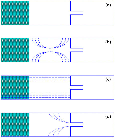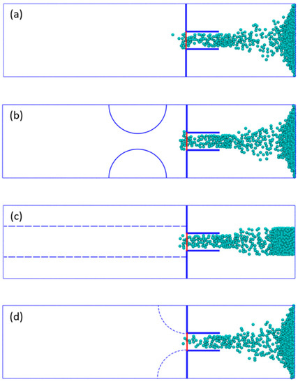 The discontinuous molecular dynamics method was used to simulate an evacuation process. During the simulations, 400 people (modeled as spheres) moved toward the exit door. The driving force was simulated as a potential well, where the minimal was located near the exit. The random movements of the spheres followed Brownian motions. The room had dimensions of 40 × 16 (L × W) m2. The exit door was 3 m wide. Four configurations were simulated as shown in Figure 8. The configurations are as follows: (a) Reference configuration, (b) kinetic contoured wall, (c) linear compression wall, and (d) curved egression wall-kinetic wall located at an the entrance/exit. For configurations (b), (c), and (d), seven different parameters were used. Configurations (b) and (d) had different radii of curvature. In the case of (c), different compressing distances were used.
